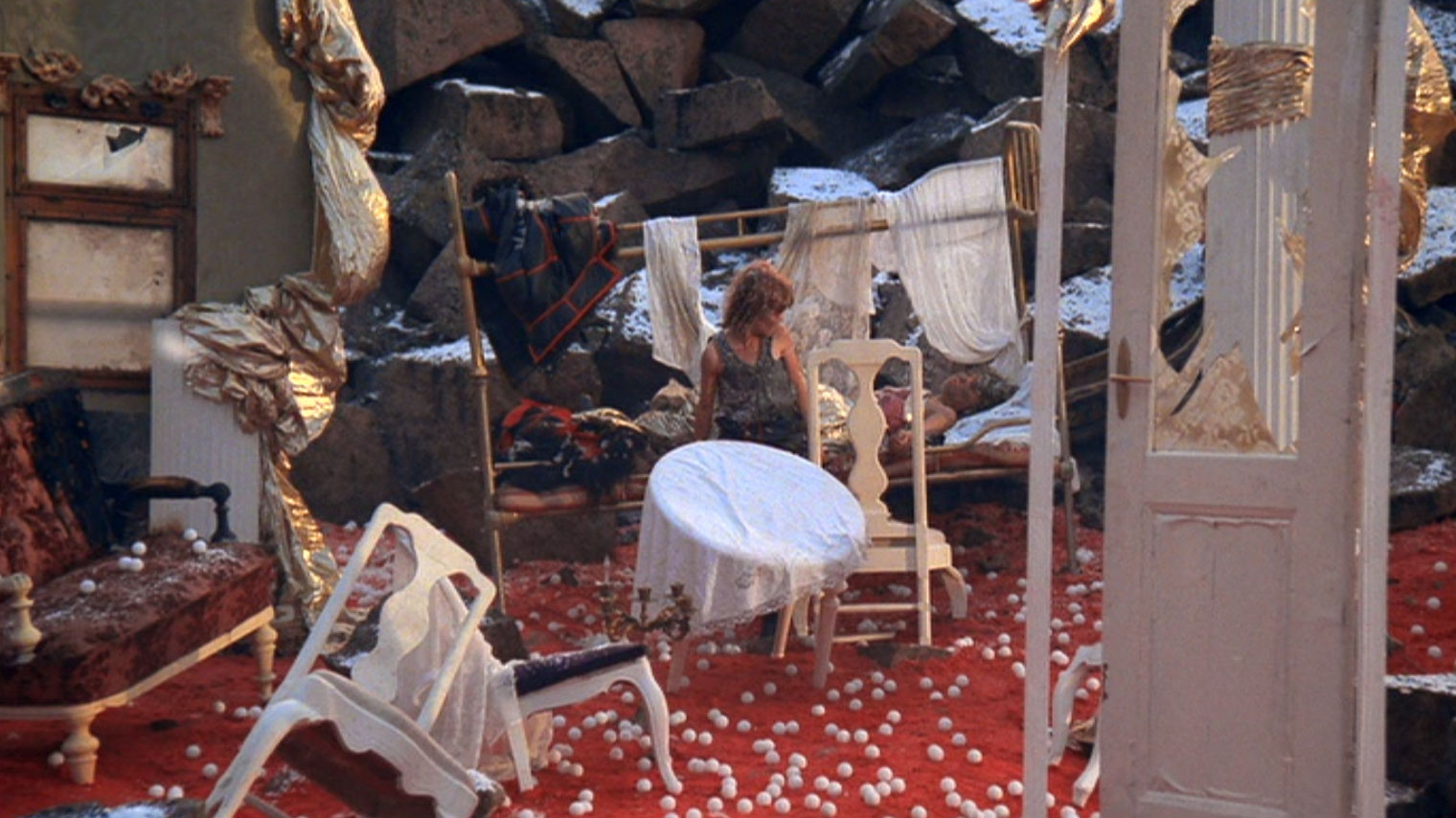 Rosvojen leiri on golfpalloja punaisella matolla. Asetelma on järjetön, ja samalla todella tasapainoinen ja ilmaisuvoimainen. Ei uskoisi, että tämä näkymä on peräisin suomalaisesta lastenelokuvasta.