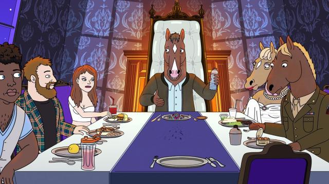 The View from Halfway Downissa Bojack tapaa illallisen äärellä kuolleita läheisiään. Olen hieman yllättynyt, että joukkoon mahtuvat sellaiset mitättömyydet kuin Corduroy Jackson-Jackson ja Zach Braff, mutta ehkäpä jakson kerronta edellyttää heidän läsnäoloaan. Illallispöydässä kukin osallistujista saa eteensä viimeisen ateriansa: Corduroy syö sitruunaa, Herb Kazzaz maapähkinöitä, Beatrice vanhainkodin laitosruokaa ja Crackerjack armeijan purkkiateriaa. Bojackille katetaan pillereitä ja uima-altaan kloorivettä. Sarah Lynnin lautasella on hampurilainen ja ranskalaisia – ilmeisesti hän ja Bojack ajoivat planetaariolle pikaruokaravintolan kautta.