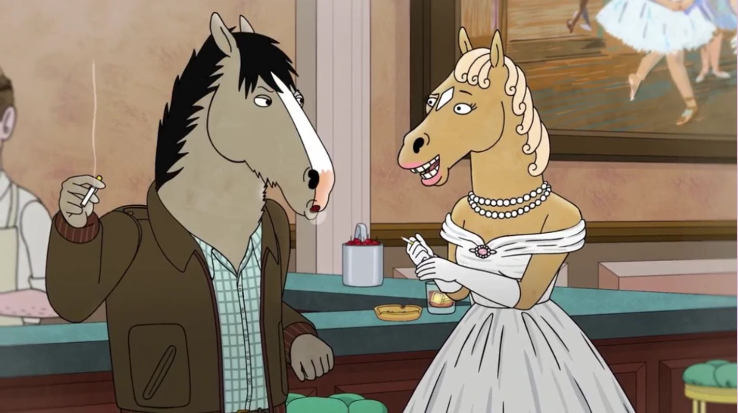 The View from Halfway Downissa Bojack tapaa illallisen äärellä kuolleita läheisiään. Olen hieman yllättynyt, että joukkoon mahtuvat sellaiset mitättömyydet kuin Corduroy Jackson-Jackson ja Zach Braff, mutta ehkäpä jakson kerronta edellyttää heidän läsnäoloaan. Illallispöydässä kukin osallistujista saa eteensä viimeisen ateriansa: Corduroy syö sitruunaa, Herb Kazzaz maapähkinöitä, Beatrice vanhainkodin laitosruokaa ja Crackerjack armeijan purkkiateriaa. Bojackille katetaan pillereitä ja uima-altaan kloorivettä. Sarah Lynnin lautasella on hampurilainen ja ranskalaisia – ilmeisesti hän ja Bojack ajoivat planetaariolle pikaruokaravintolan kautta.